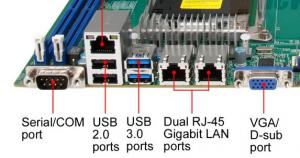 Zezadu má počítač konektory 2x USB 3.0, 2x USB 2.0, 2x Gbit síť, 1x COM, 1x VGA výstup integrované grafiky.