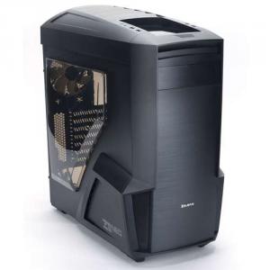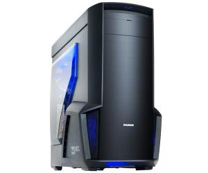 Na horním panelu jsou vyvedeny 2 konektory USB 2.0, 2 konektory USB 3.0 a standardní audio konektory (sluchátka a mikrofon). Skříň má průhlednou levnou bočnici a modře podsvícené ventilátory.