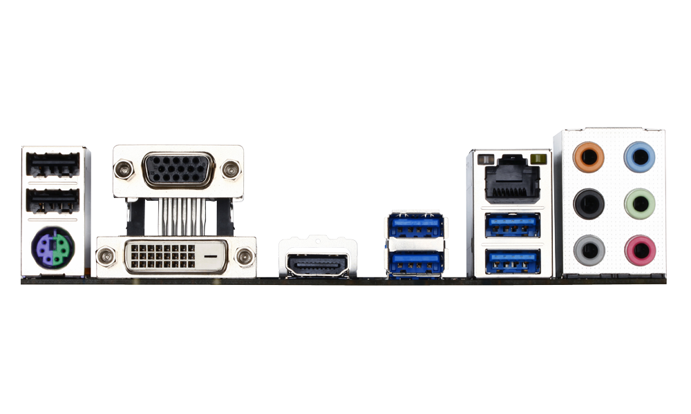 Zezadu má počítač konektory 4x USB 3.0, 2x USB 2.0, 1x Gbit síť, Jack výstupy zvuku pro až 7.1 reproduktory, 1x PS/2, obrazové výstupy pro případ neosazení samostatné grafické karty (DVI, HDMI, D-SUB).
